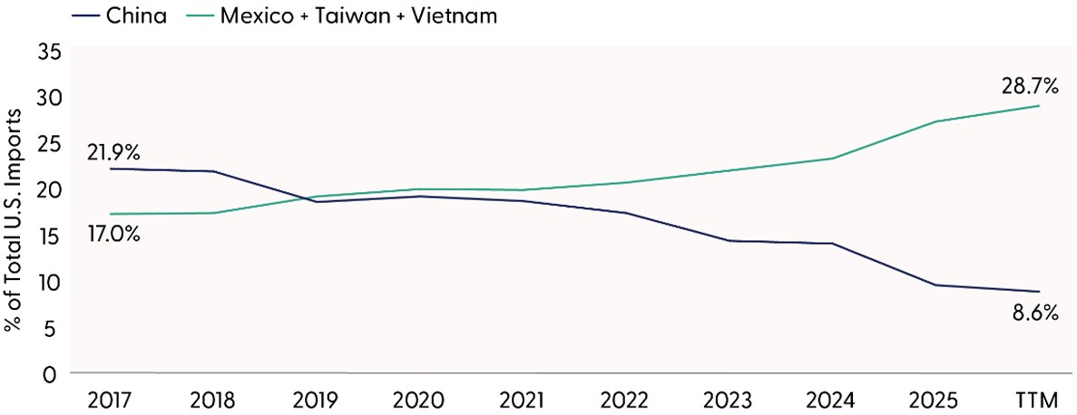 Imports from China Now Below ~9% as Mexico, Vietnam, and Taiwan Gain Share