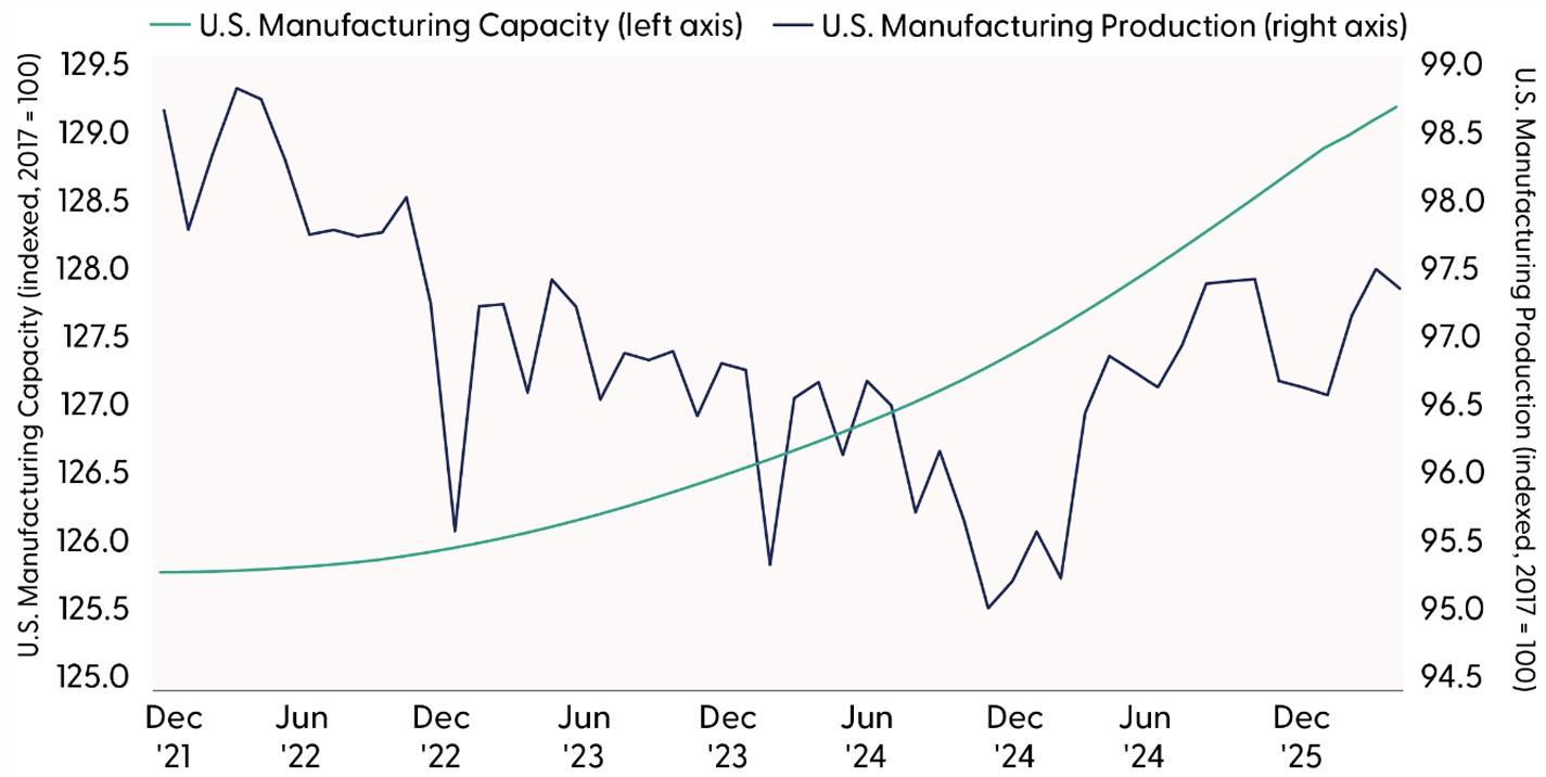 U.S. manufacturing capacity and production, seasonally adjusted index (2017 = 100), Dec 2021 – Mar 2026