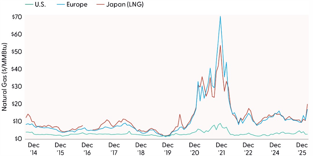 The important caveat is that this advantage may narrow at the margin as domestic demand rises. U.S. natural gas production hit record highs last year, but expanding LNG exports and rising electricity demand from data centers are beginning to tighten the domestic balance. The U.S. Energy Information Administration (EIA) sees Henry Hub rising to about $4.30/MMBtu in 2026, and some longer-range industry forecasts envision U.S. gas prices nearer $5/MMBtu in the early 2030s as export capacity and AI-related power demand grow. As for what the commodity markets are currently pricing in, the futures curve for their respective natural gas benchmarks shows the average premium for EU/Asia natural gas prices compared to domestic prices to compress from 175–200% to 20–70%. Therefore, we would not suggest that U.S. energy is going to be cheaper forever but has a meaningful cost advantage today (and a likely less meaningful but still present cost advantage in the near future), and domestic manufacturing companies benefit from that advantage relative to their foreign peers.