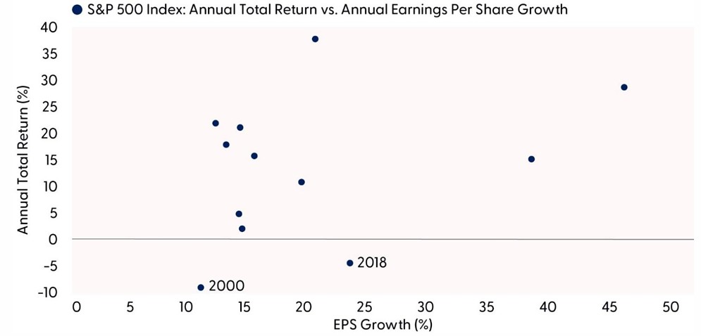 Disclosure: All indexes are unmanaged and cannot be invested in directly. Past performance is no guarantee of future results. 2003 was omitted as an outlier observation with annual earnings per share growth of 362.3% and an annual total return of 28.7%. Thank you to Evercore ISI’s equity strategy team for this concept.