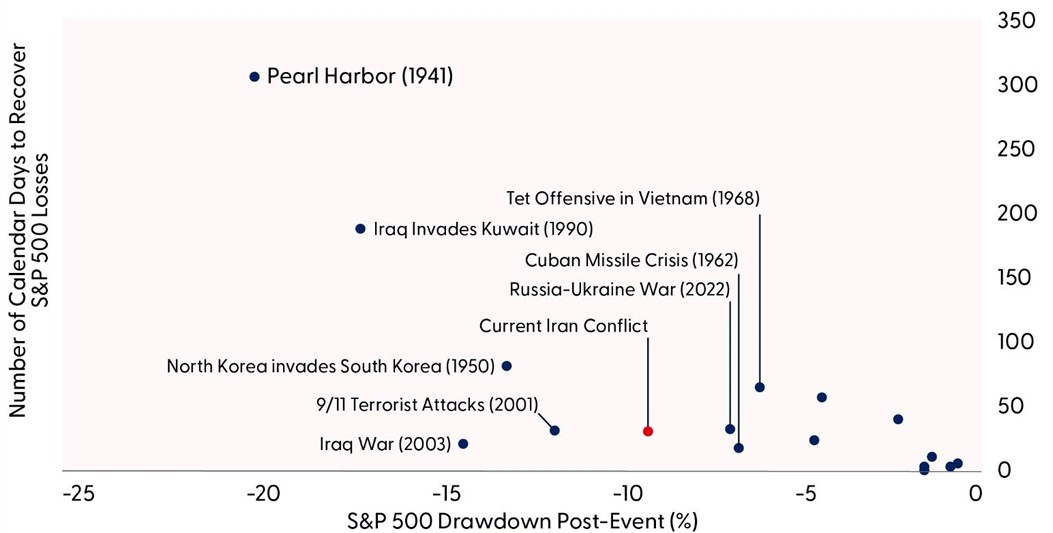 Bottom line, we believe history suggests that it’s quite possible that the 9% peak-to-trough drawdown in the S&P 500 reached in March may be all we get during this conflict. Market watchers may not have to wait too long for stocks to recover from year-to-date losses. At the same time, geopolitical uncertainty remains high enough to warrant patience and leave us comfortable recommending portfolio risk at or slightly below benchmarks currently, although past performance does not guarantee future results.