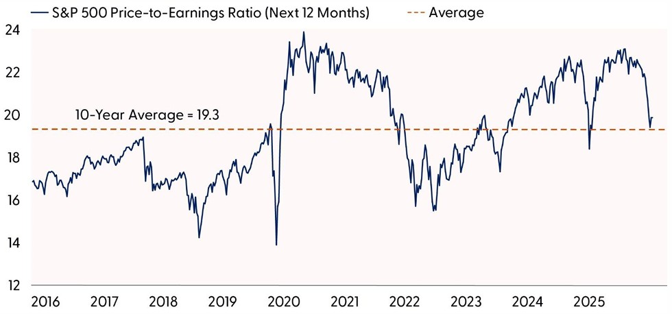 Earnings continue to provide support for stocks during this volatile period. Consensus expectations for double‑digit S&P 500 EPS growth in 2026 have not only held firm, but they have improved despite recent market stresses, resulting in more reasonable valuations and pointing toward gains for stocks in 2026.