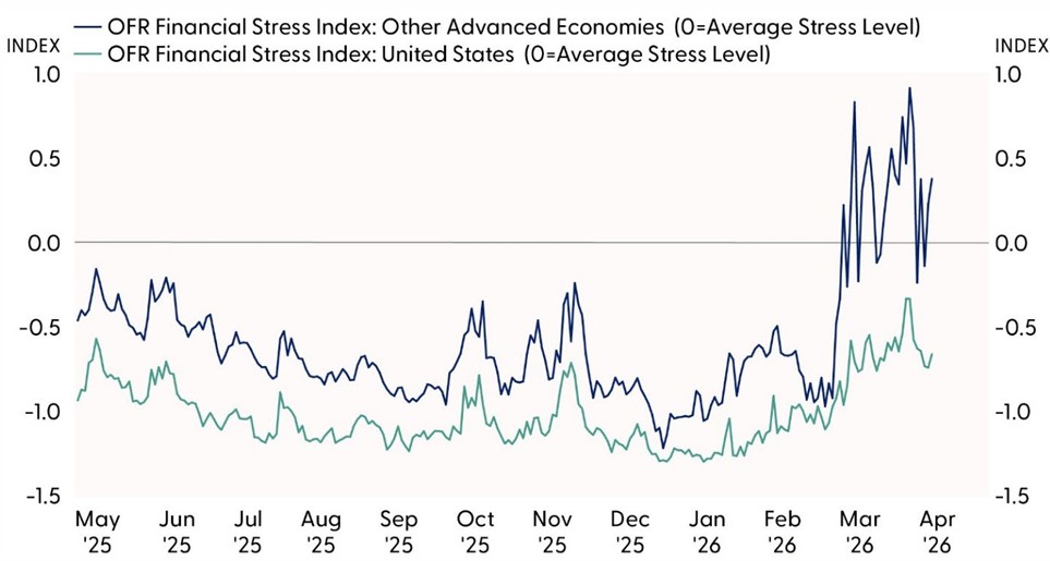 Credit spreads and funding conditions are highly valuable for tracking stress in banking and for assessing any damage from geopolitical risks. Credit spreads represent the difference in borrowing costs for firms of different creditworthiness, and in times of stress, credit spreads may widen when default risk increases or credit market functioning is disrupted. Wider spreads may indicate that investors are less willing to hold debt, increasing costs for borrowers to get funding. Tying the previous concept with this, financial stress was not as high during the Russian invasion of Ukraine as the stress induced by fundamental economic factors like high inflation and tighter monetary policy. Bringing it into today’s global energy shock, credit indicators remain below average stress levels in the U.S. but are above average in advanced economies. Funding indicators, which measure how easily financial institutions can fund their activities, have tightened in recent days. In times of stress, funding markets can freeze if participants perceive greater counterparty credit risk or liquidity risk. Rising stress in funding will be important to monitor.